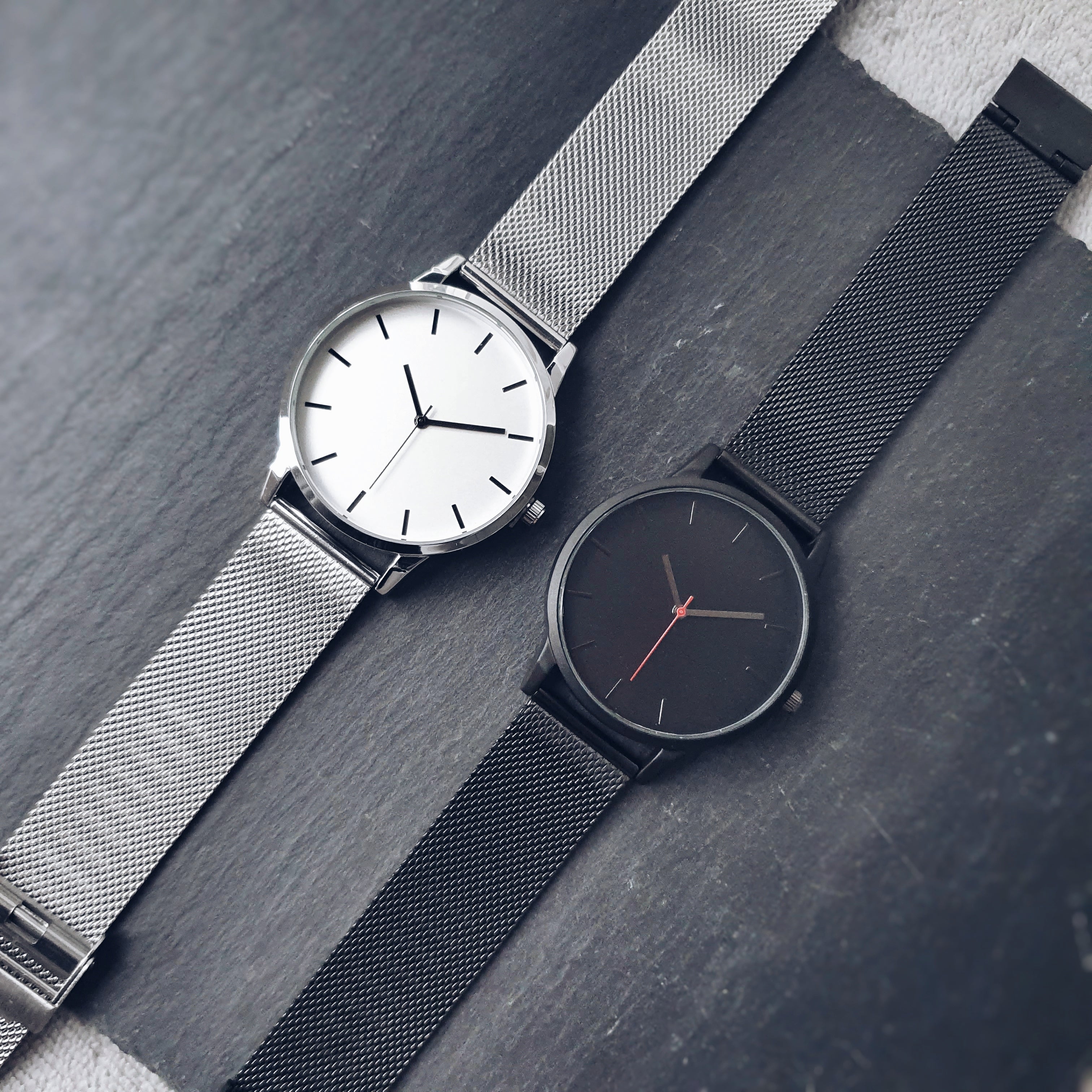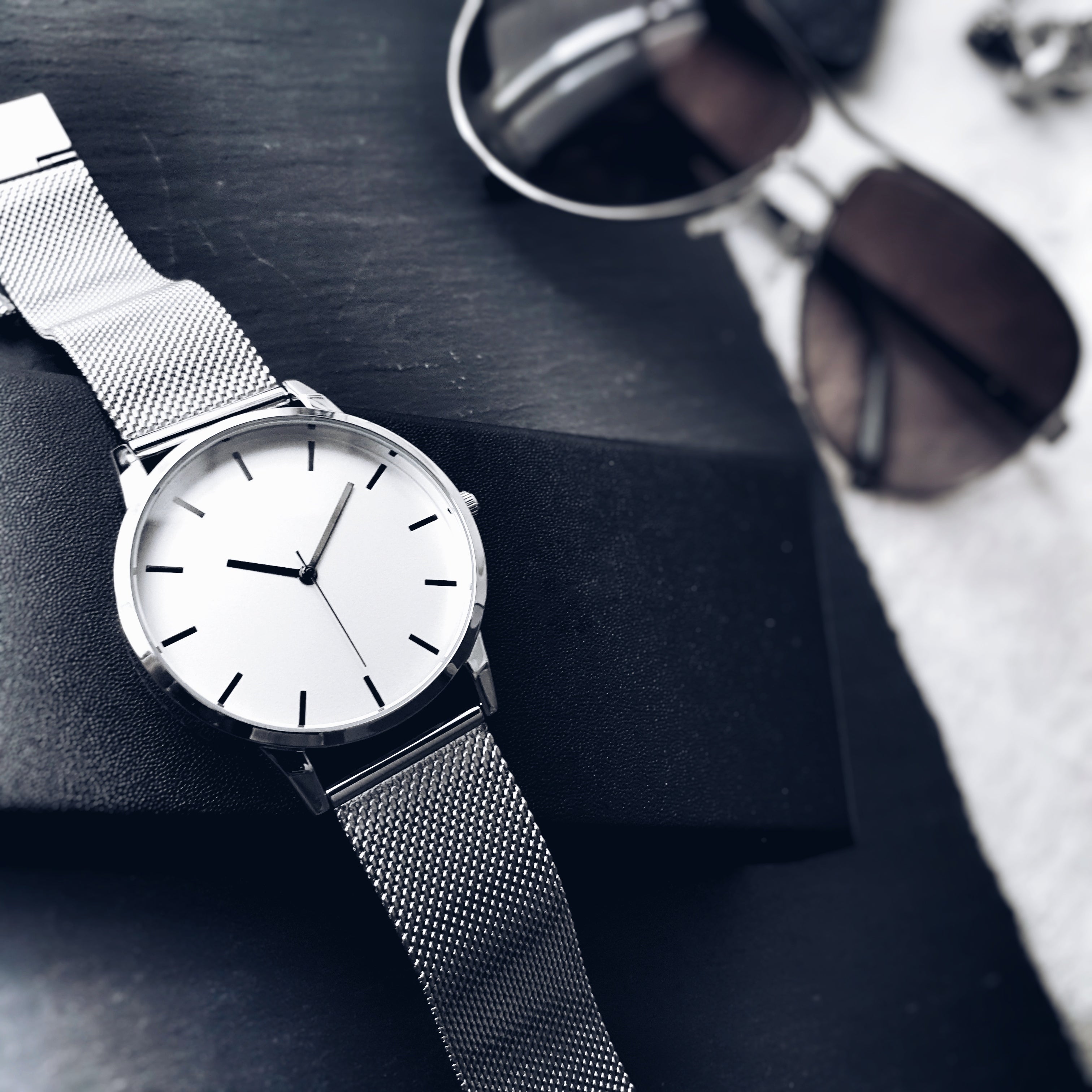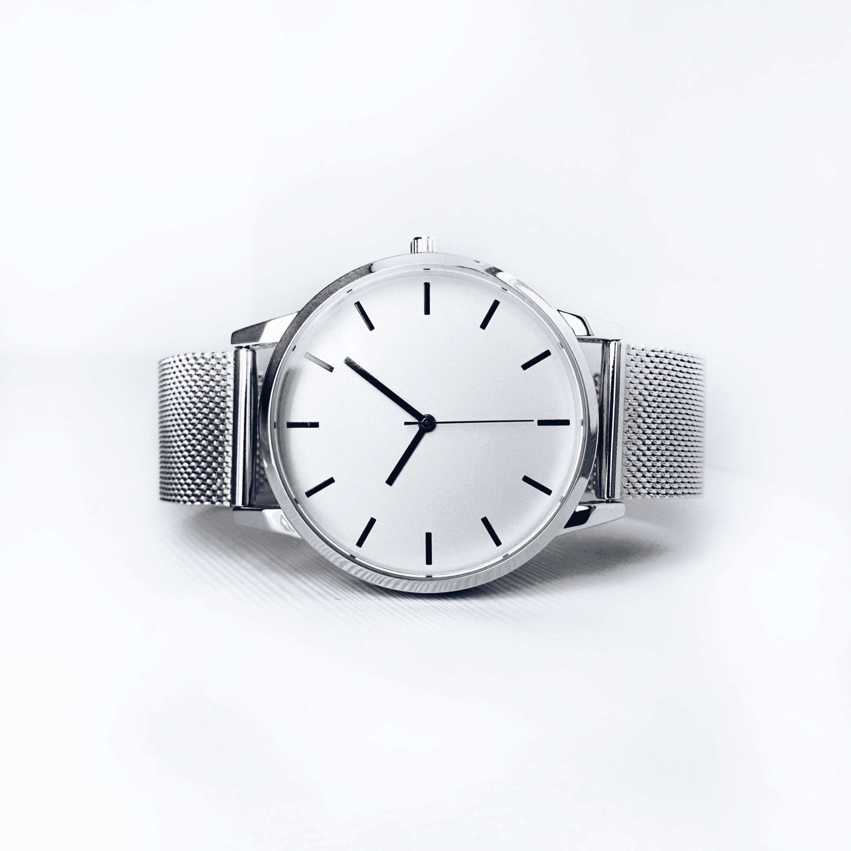 The Monochrome series watch expresses a bold and confident style. The minimalist dial is encased in a 40mm polished silver case, exuding a clean and sharp aesthetic. The straight black hands provide a striking contrast against the matte off-white dial. Paired with a brilliant silver mesh strap, the watch is a versatile statement piece.